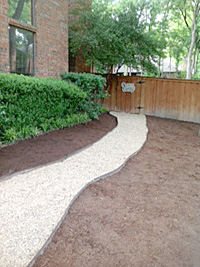 photo(4)Next was a larger and even longer ignored space to tackle, an utterly bare shaded area under trees where nothing grew and we rarely ventured. The time had come to create a pea-gravel pathway from side gate to front yard, along with borders and mulch to re-establish the greater shaded area.