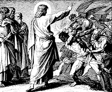 Jesus commanded the demons out of the man and into a herd of swine who quickly threw themselves off a cliff, thus ‘flying’ to their deaths.
